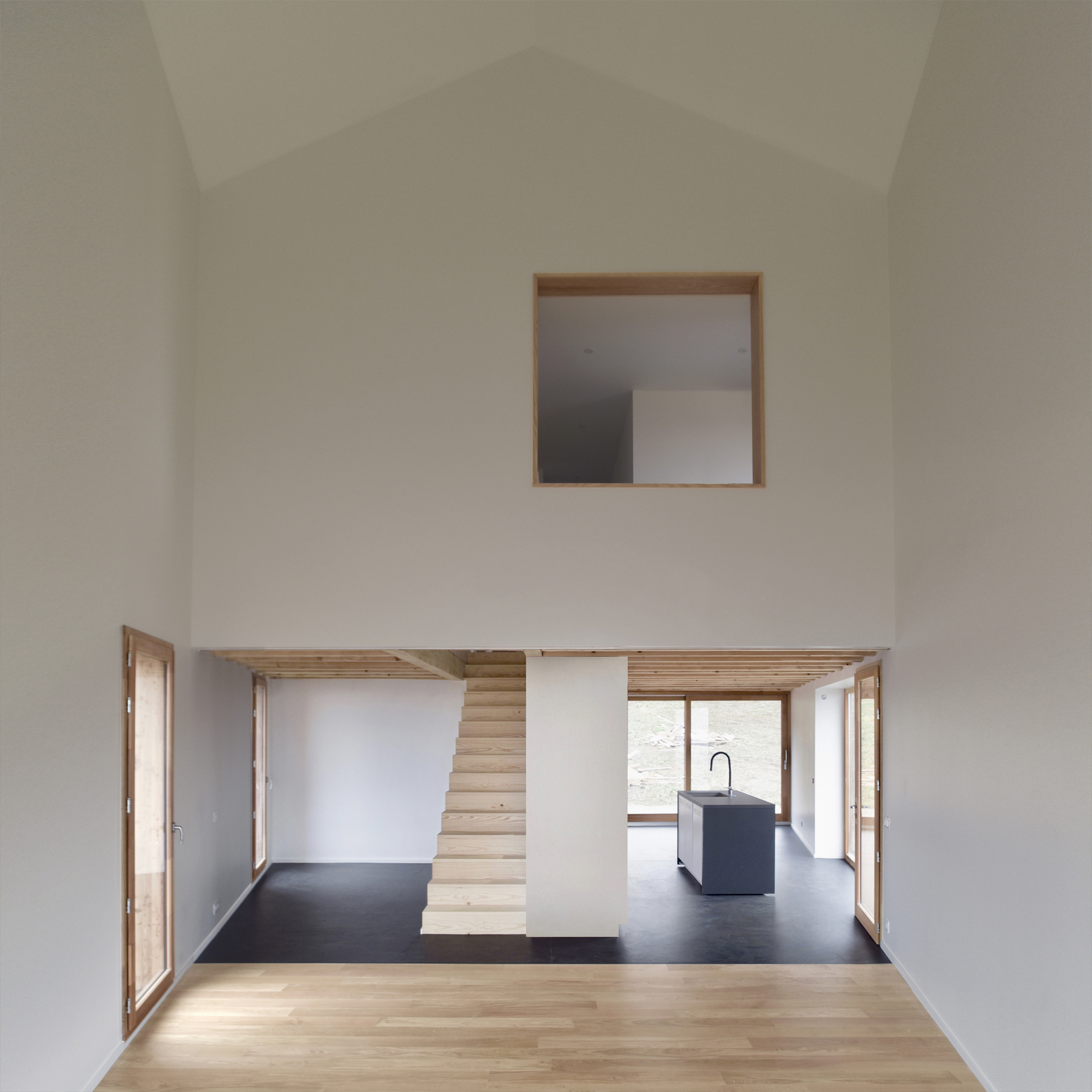 Les recherches d’économies conduisent à minimiser l’emprise au sol de la construction et à répartir le programme sur trois niveaux. Un socle semi-enterré abrite le garage et ancre la maison dans la pente. Au premier étage, les pièces de vie bénéficient de quatre orientations et communiquent de plain-pied avec le jardin arrière, plus intime. Enfin, les chambres des enfants profitent des hauteurs importantes sous plafond pour accueillir des cabanes suspendues à la charpente et accessibles par de petites échelles.