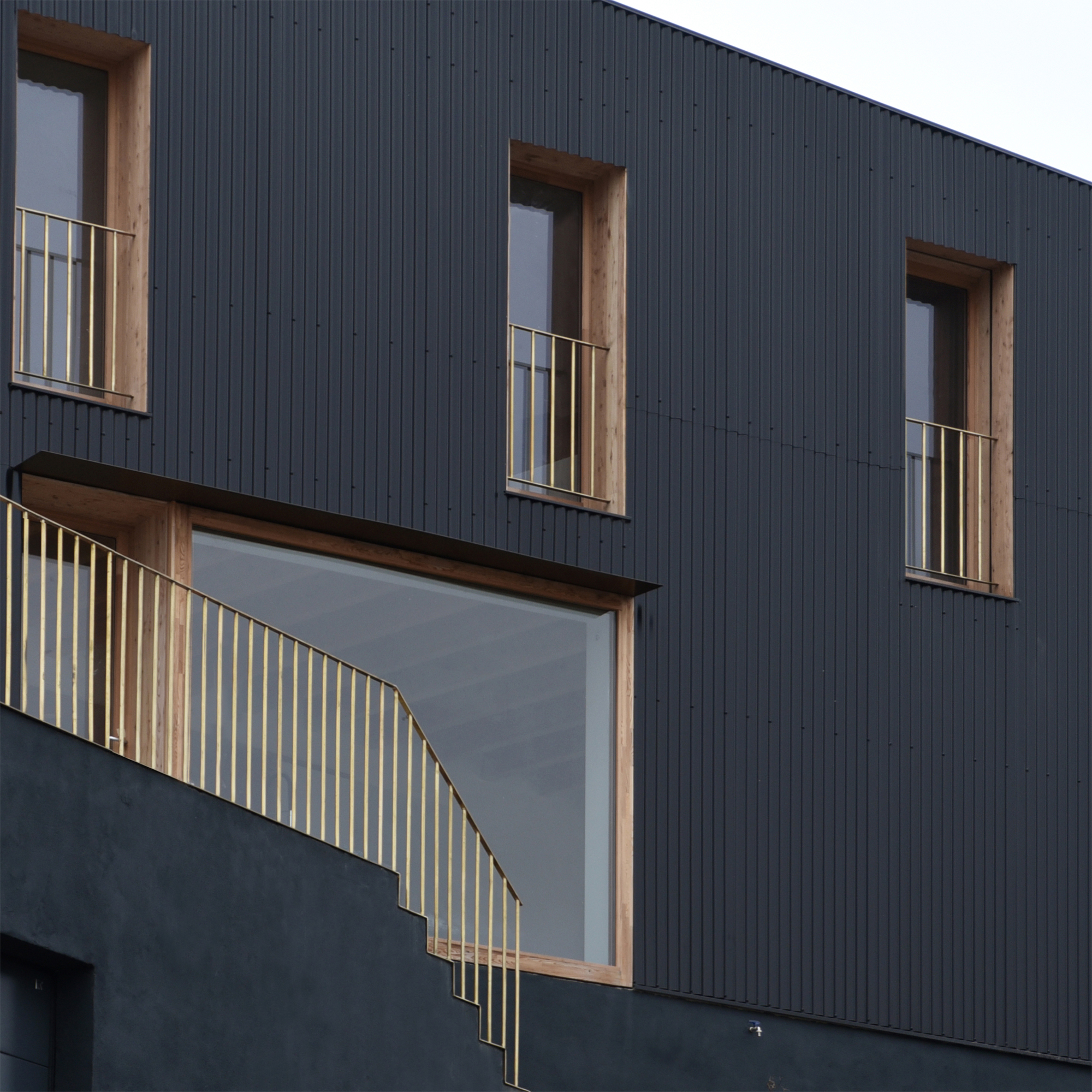 Construit en briques de terre cuite, le projet emploie une vêture en tôle ondulée dans une utilisation raffinée et soucieuse de sa mise en œuvre. De grandes baies en mélèze offrent des vues dégagées sur la chaîne des Puys et le bourg de Pont-du-Château situé en contre-bas.