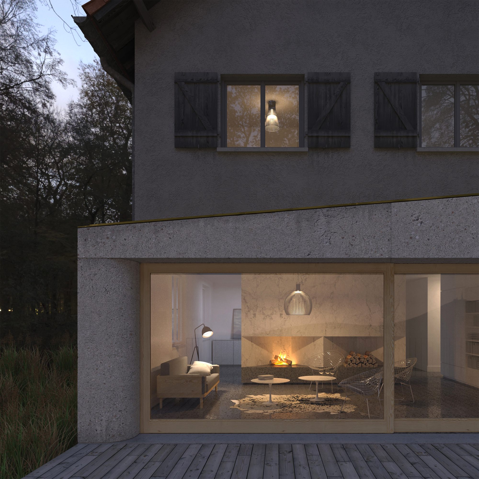 Réalisée en béton de site, la géométrie de l’extension découle de la proportion singulière des toitures existantes. Aux extrémités, les jambages arrondis rappellent certains détails récurrents des maisons de faubourgs clermontois, construites à la même période que la maison.