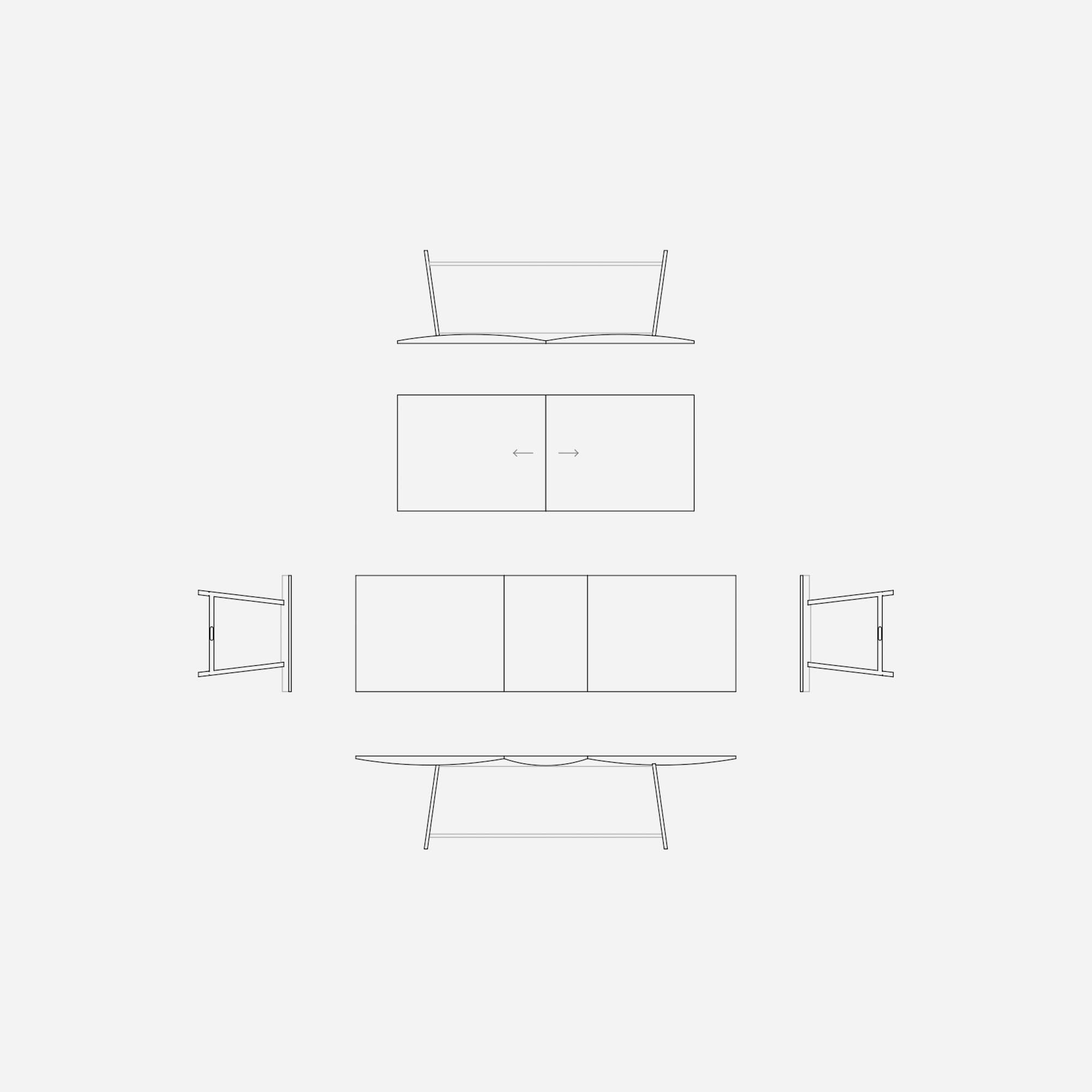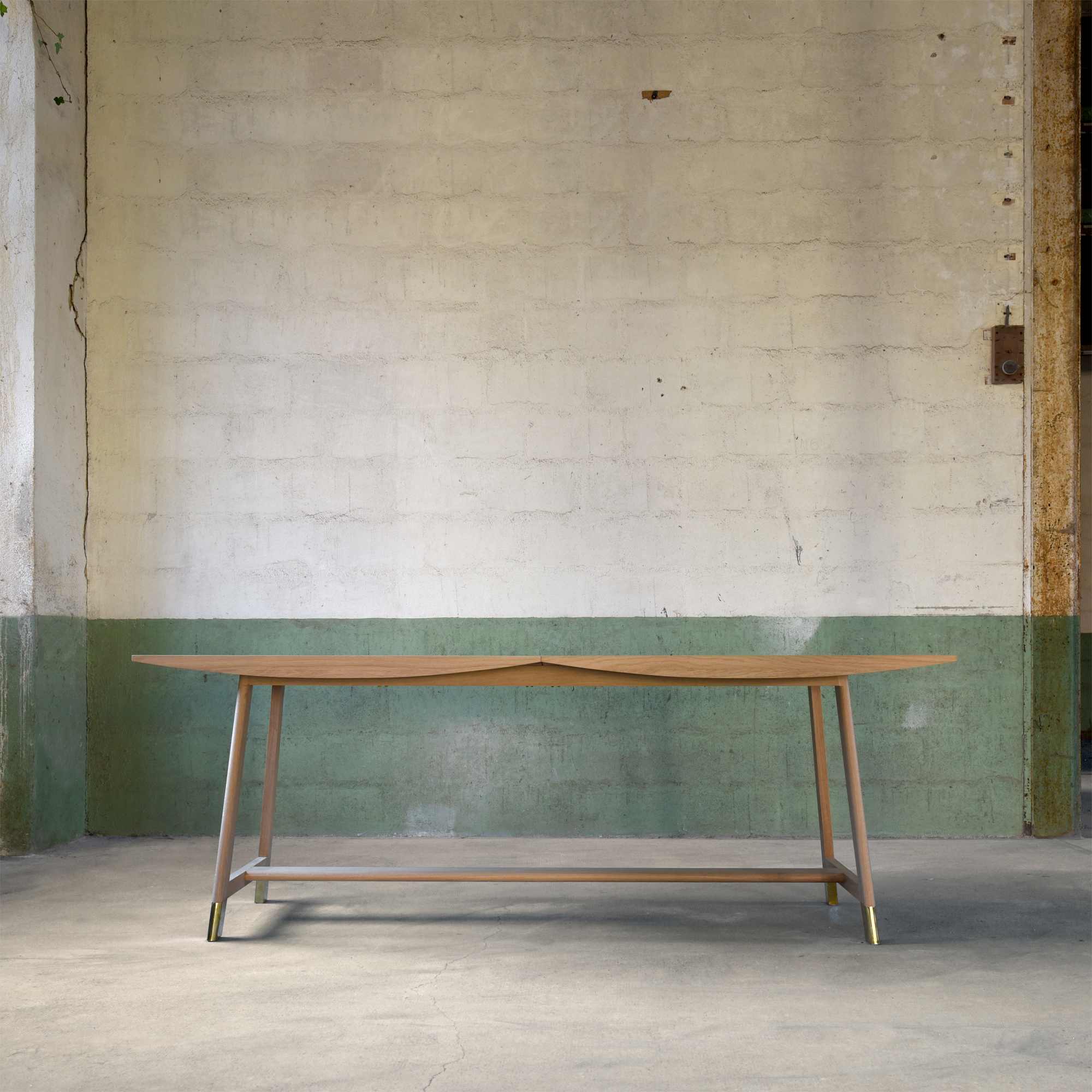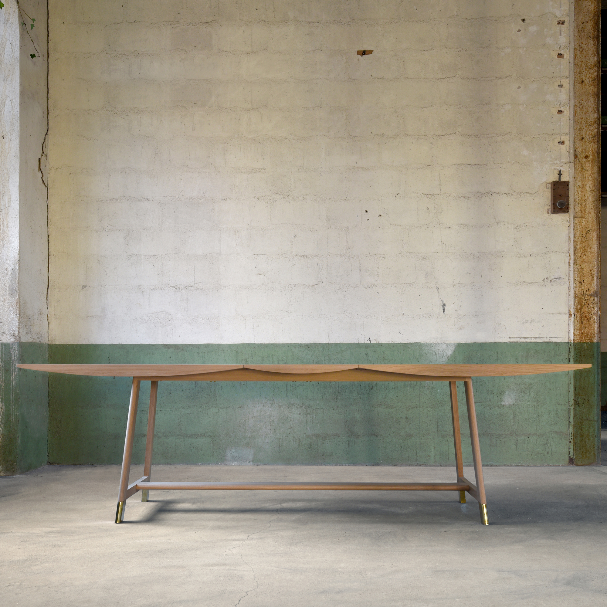 La silhouette galbée du plateau, à l’image d’un drapé, renvoie à la grande liberté formelle de l’architecture du début du XXème siècle. Une pièce centrale, amovible, permet de rallonger ou de raccourcir facilement la table en fonction du nombre de convives.
